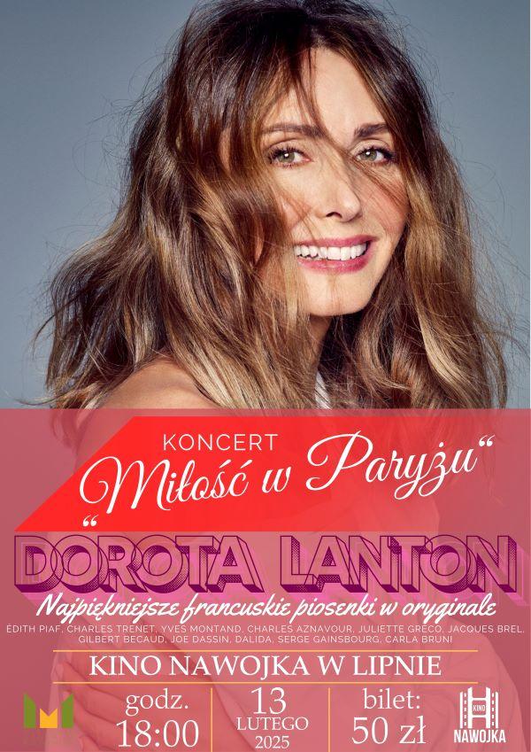 „Miłość w Paryżu” Najpiękniejsze piosenki francuskie w brawurowym wykonaniu aktorki i piosenkarki Doroty Lanton. Dorota Lanton -Aktorka i piosenkarka uznawana za jedną z najlepszych w Polsce interpretatorek piosenki francuskiej wykonuje w oryginale największe przeboje Edith Piaf, Jacquesa Brela, Juliette Greco, Charlesa Aznavoura, Josephine Baker, Carli Bruni oraz czołowych, współczesnych artystów i