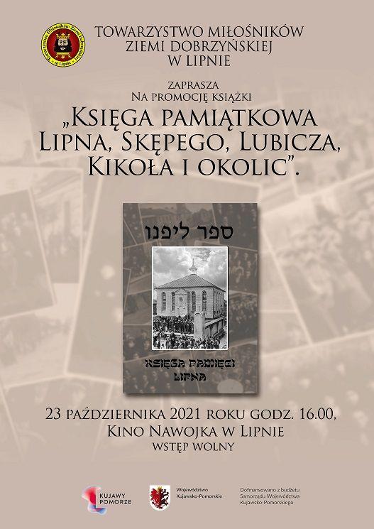 Towarzystwo Miłośników Ziemi Dobrzyńskiej w Lipnie zaprasza na promocję publikacji pt. "Księga pamiątkowa Lipna, Skępego, Lubicza, Kikoła i okolic". Treścią opracowania są wspomnienia mniejszości żydowskiej naszego regionu z okresu przedwojennego i powojennego. Wydarzenie będzie miało miejsce w kinie Nawojka w Lipnie, 23 października b.r. o godz. 16:00. Wstęp